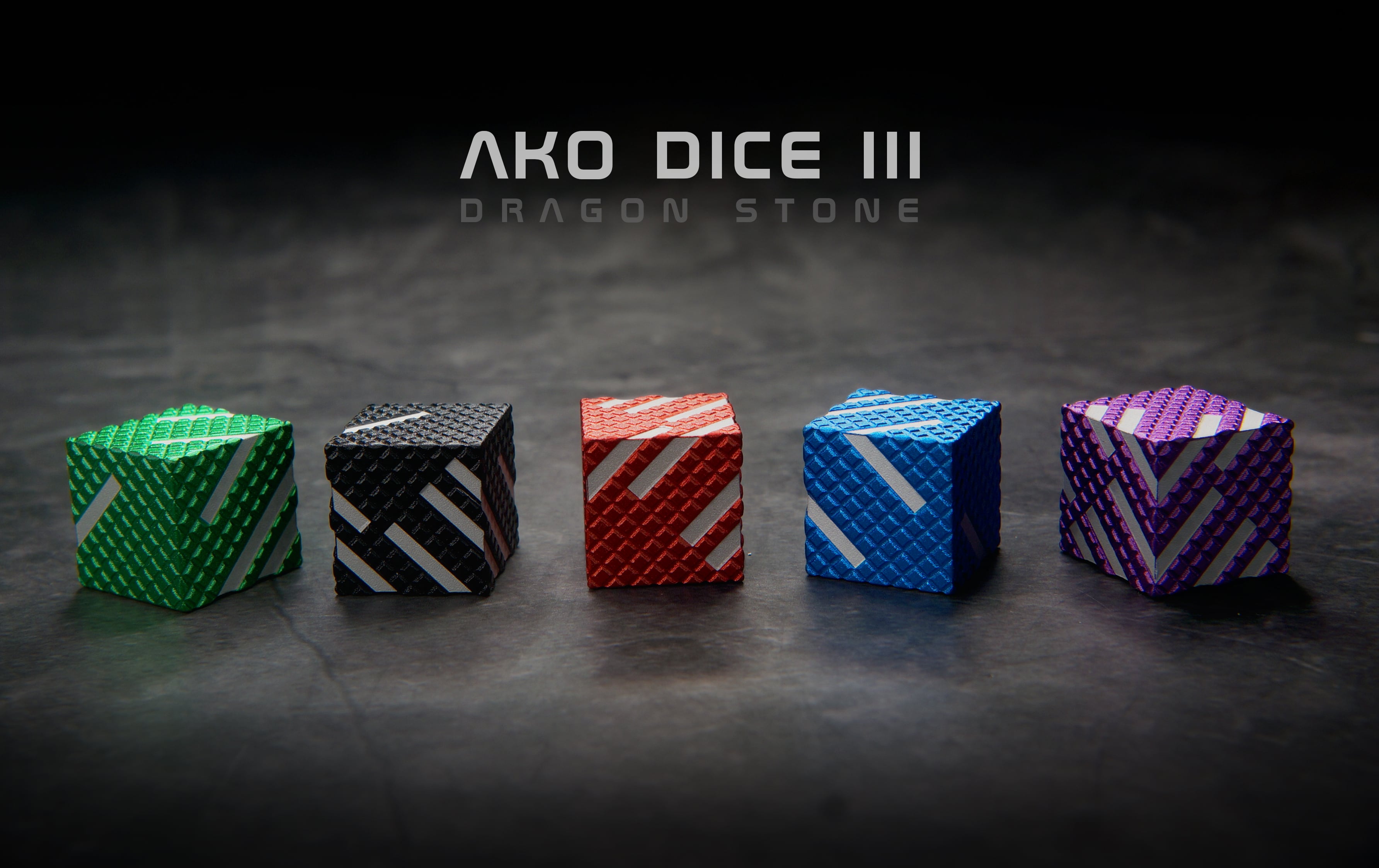 AKO DICE III, the latest of the dice in the AKO Dice line, features our new "Dragon Stone" design, which draws inspiration from sci-fi for a unique and thrilling tone. Measuring 16mm x 16mm, AKO DICE III are the convenient and fun dice for long-time players and newcomers alike. The modern linework adds a twist to the normal dice design, while the texture resembles dragon scales, a callback to the idea of a cyber dragon. The pip lines, meanwhile, are the dragon's claw marks, each one representing the value of that face.